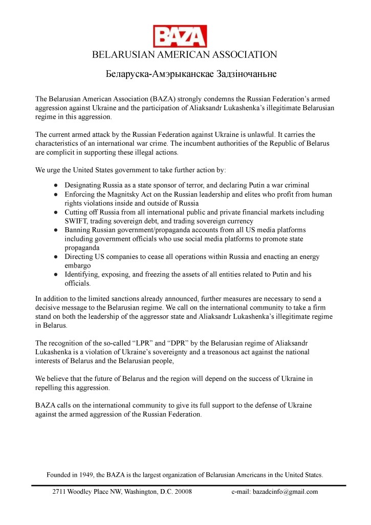The Belarusian American Association (BAZA) strongly condemns the Russian Federation’s armed aggression against Ukraine and the participation of Aliaksandr Lukashenka’s illegitimate Belarusian regime in this aggression.